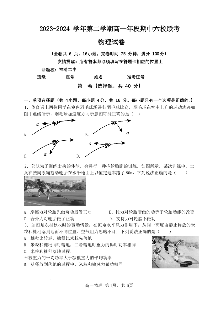 福建省福州市六校联考2023-2024学年高一下学期期中联考物理