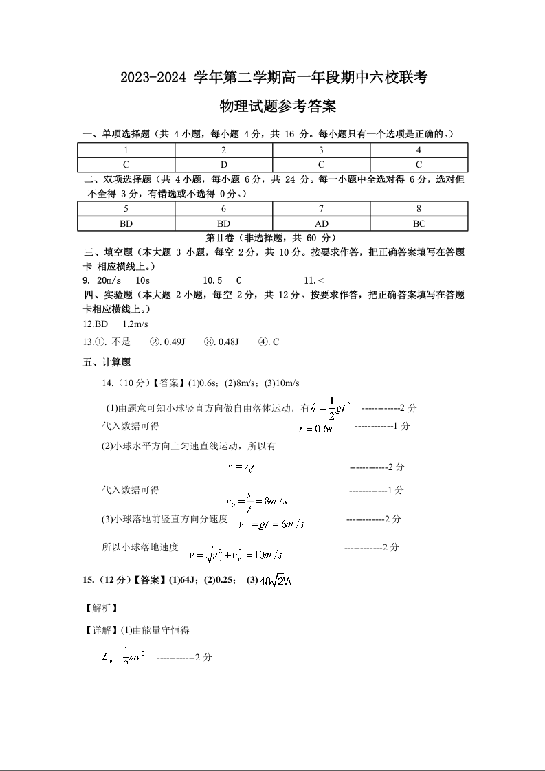 福建省福州市六校联考2023-2024学年高一下学期期中联考物理答案