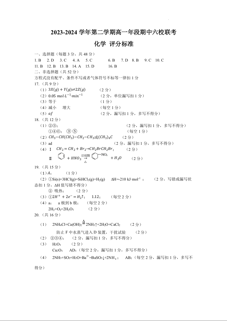 福建省福州市六校联考2023-2024学年高一下学期期中联考化学答案