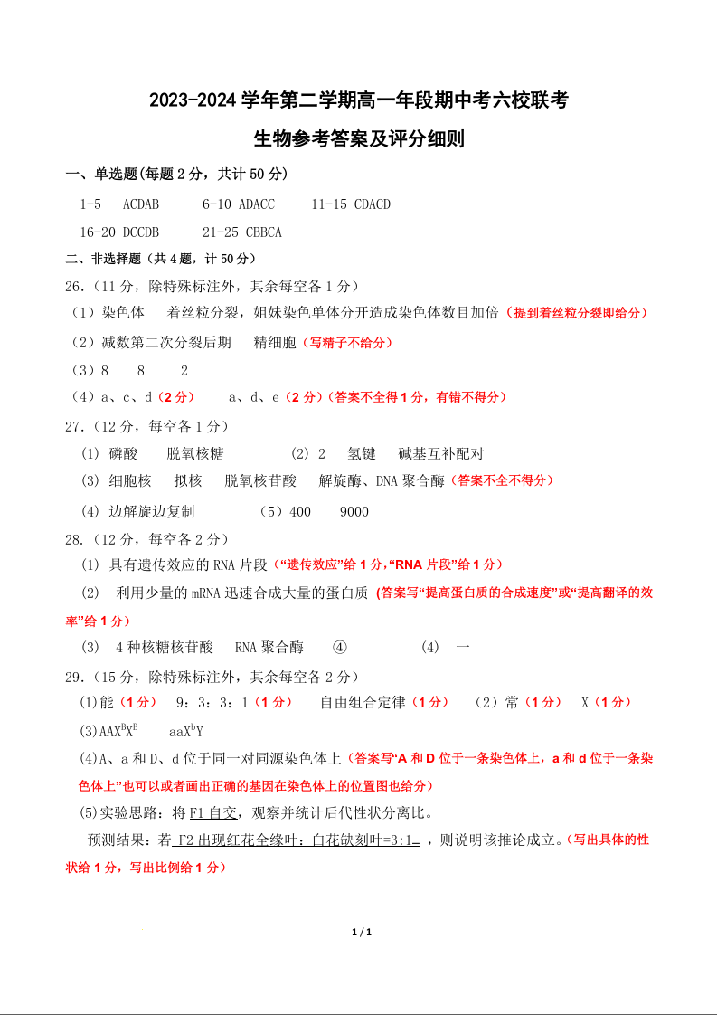 福建省福州市六校联考2023-2024学年高一下学期期中联考生物答案