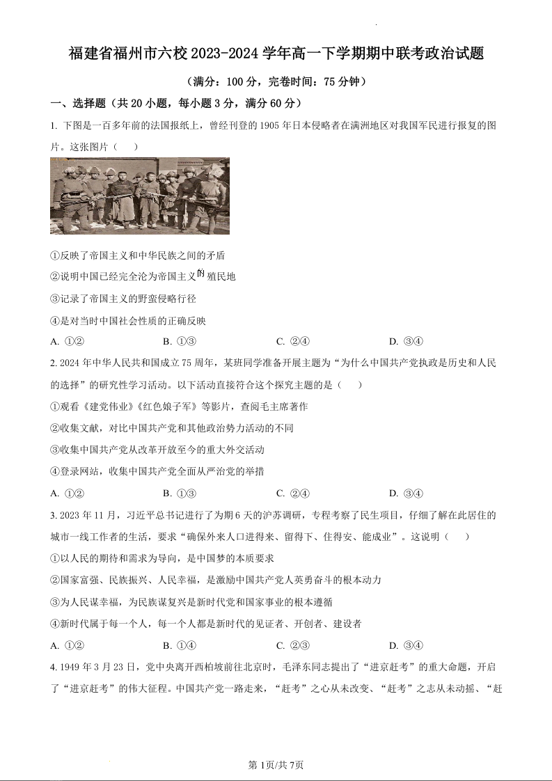 福建省福州市六校联考2023-2024学年高一下学期期中联考政治(原卷版)