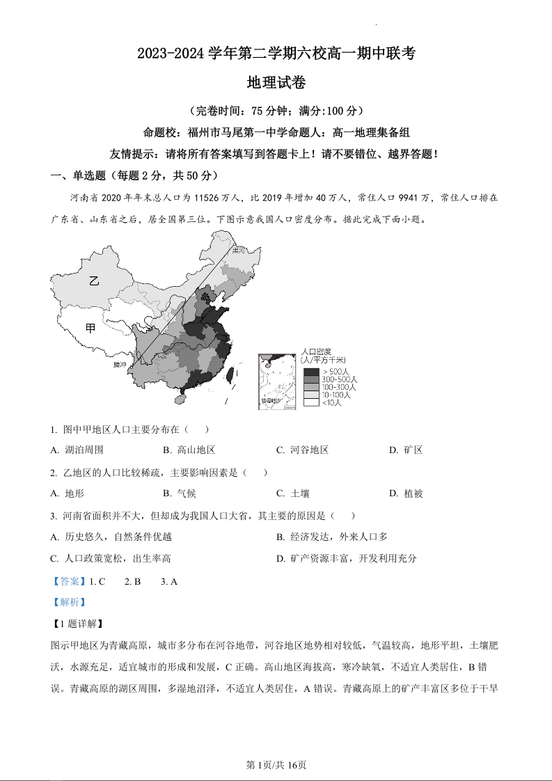 福建省福州市六校联考2023-2024学年高一下学期期中联考地理(精品解析版)