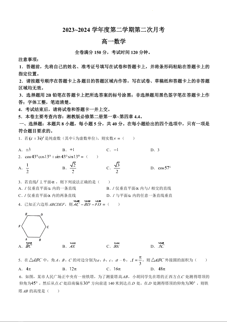 甘肃省武威市2023-2024学年高一下学期6月月考数学+答案