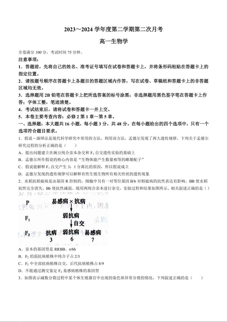 甘肃省武威市2023-2024学年高一下学期6月月考生物+答案
