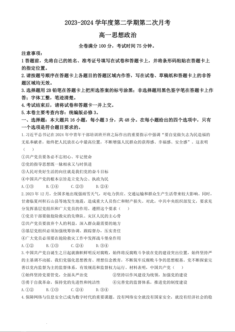 甘肃省武威市2023-2024学年高一下学期6月月考政治+答案