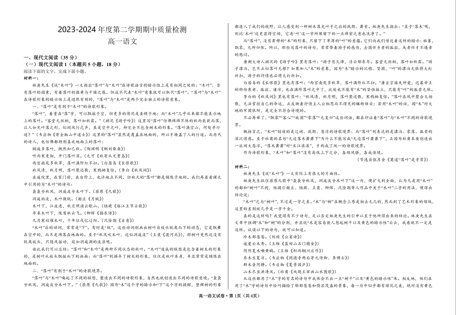 甘肃省武威市凉州区2023-2024学年高一下学期期中质量检测语文
