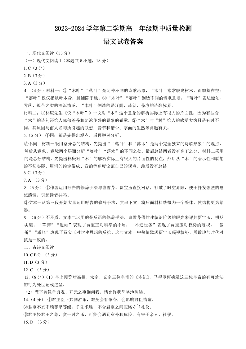 甘肃省武威市凉州区2023-2024学年高一下学期期中质量检测语文答案