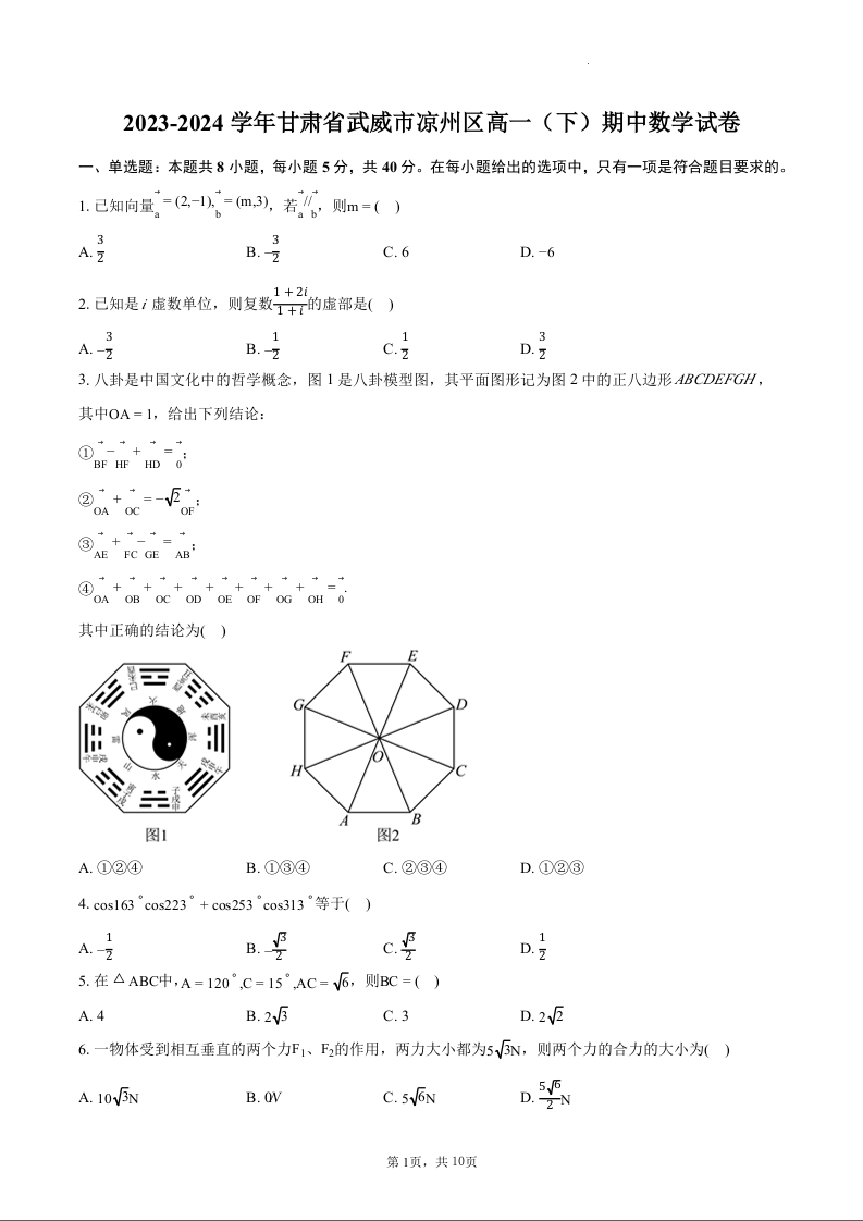 甘肃省武威市凉州区2023-2024学年高一下学期期中质量检测数学+答案