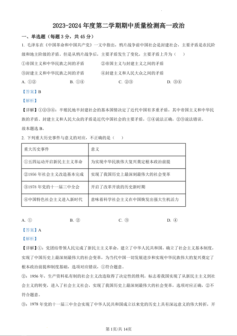 甘肃省武威市凉州区2023-2024学年高一下学期期中质量检测政治(精品解析版)