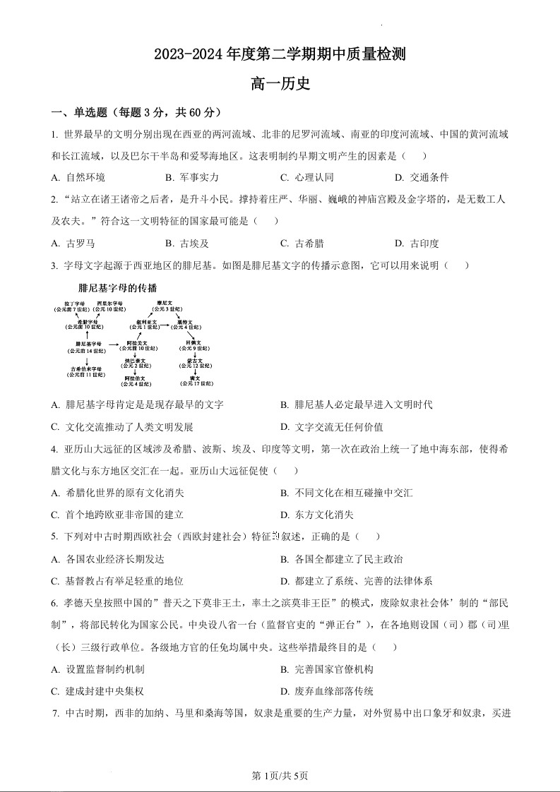 甘肃省武威市凉州区2023-2024学年高一下学期期中质量检测历史(原卷版)