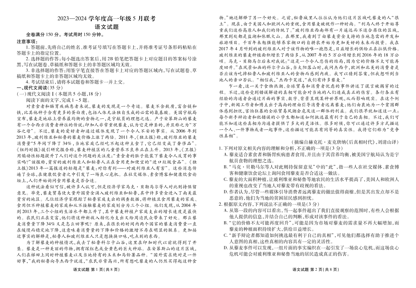 广东省河源市部分学校2023-2024学年高一下学期5月期中联考语文