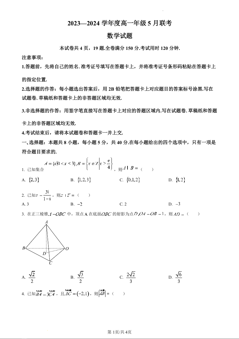 广东省河源市部分学校2023-2024学年高一下学期5月期中联考数学(原卷版)