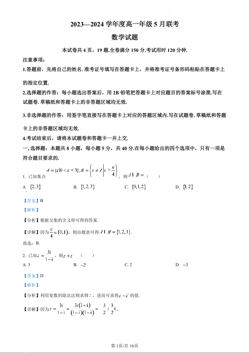 广东省河源市部分学校2023-2024学年高一下学期5月期中联考数学(精品解析版)
