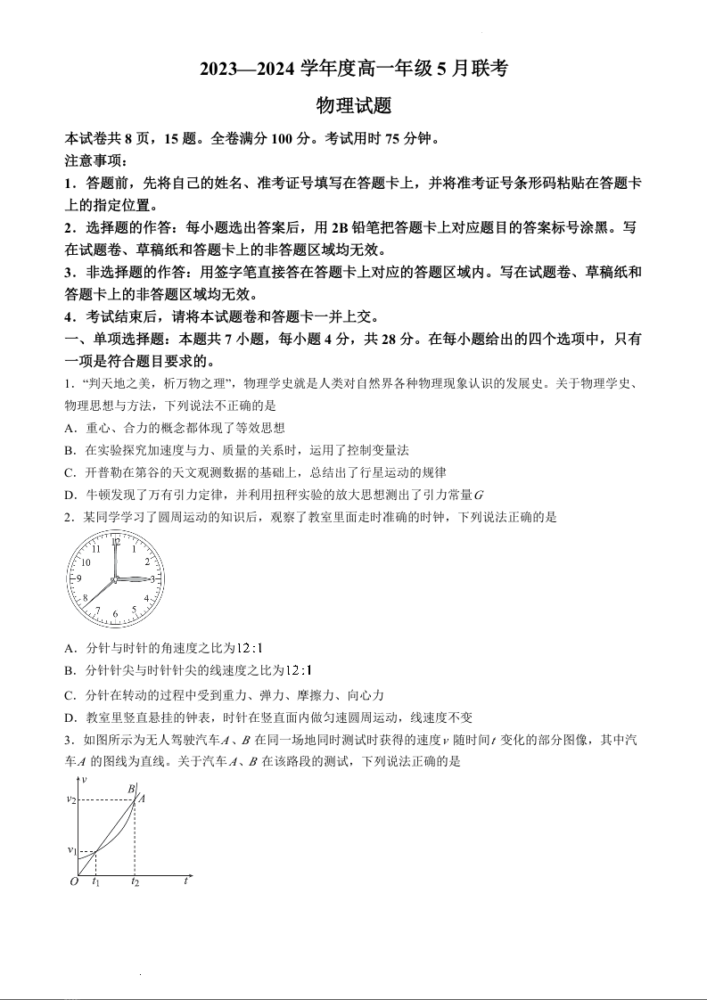 广东省河源市部分学校2023-2024学年高一下学期5月期中联考物理+答案