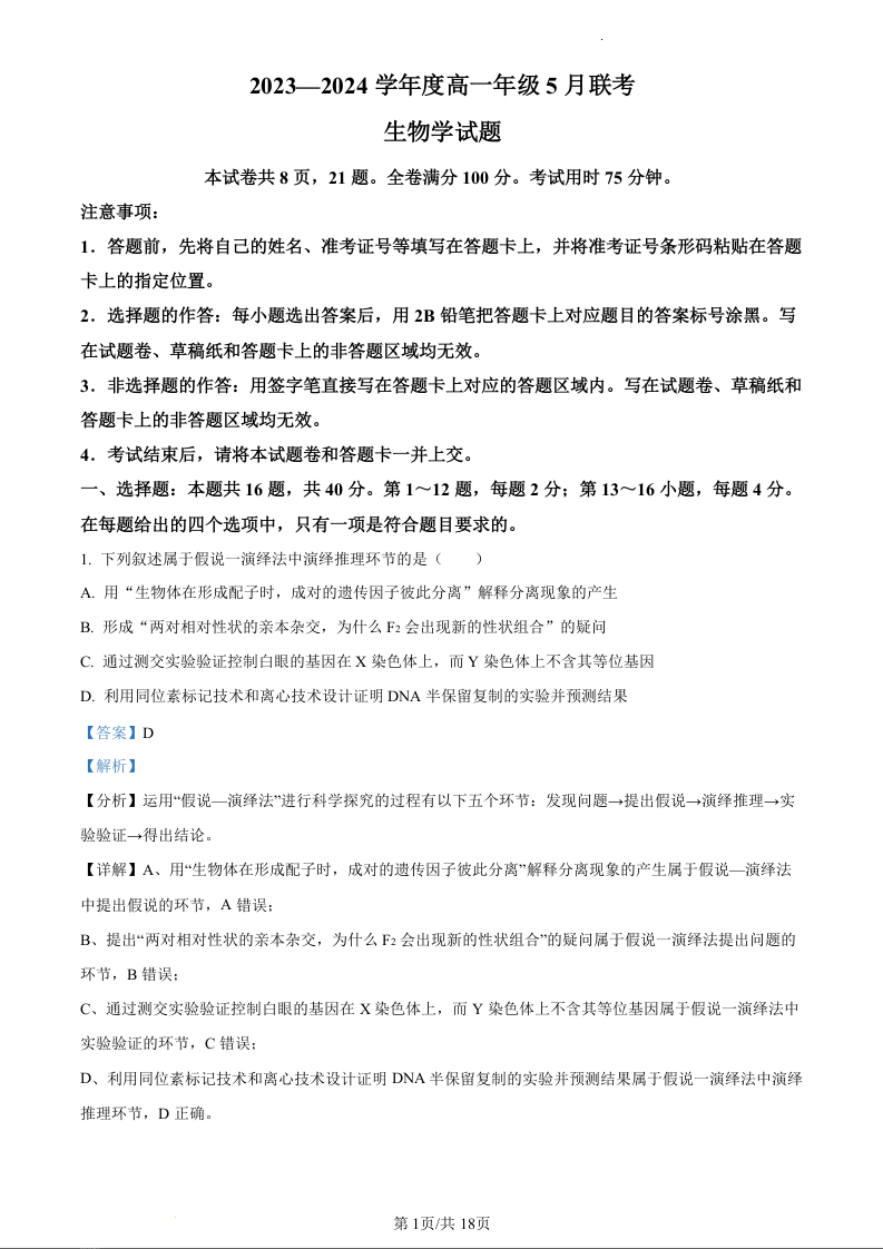 广东省河源市部分学校2023-2024学年高一下学期5月期中联考生物(精品解析版)