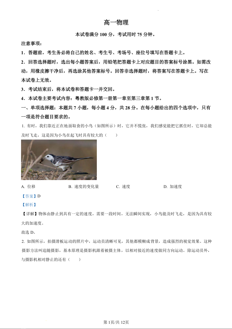 广东省湛江市2023-2024学年高一上学期期中考试物理(精品解析版)