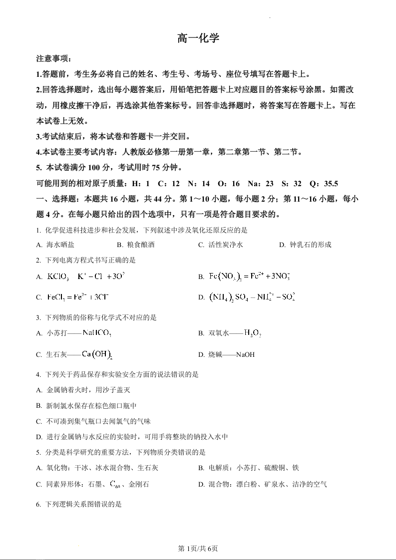 广东省湛江市2023-2024学年高一上学期期中考试化学(原卷版)