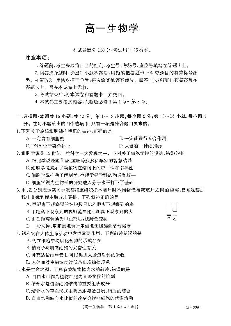 广东省湛江市2023-2024学年高一上学期期中考试生物