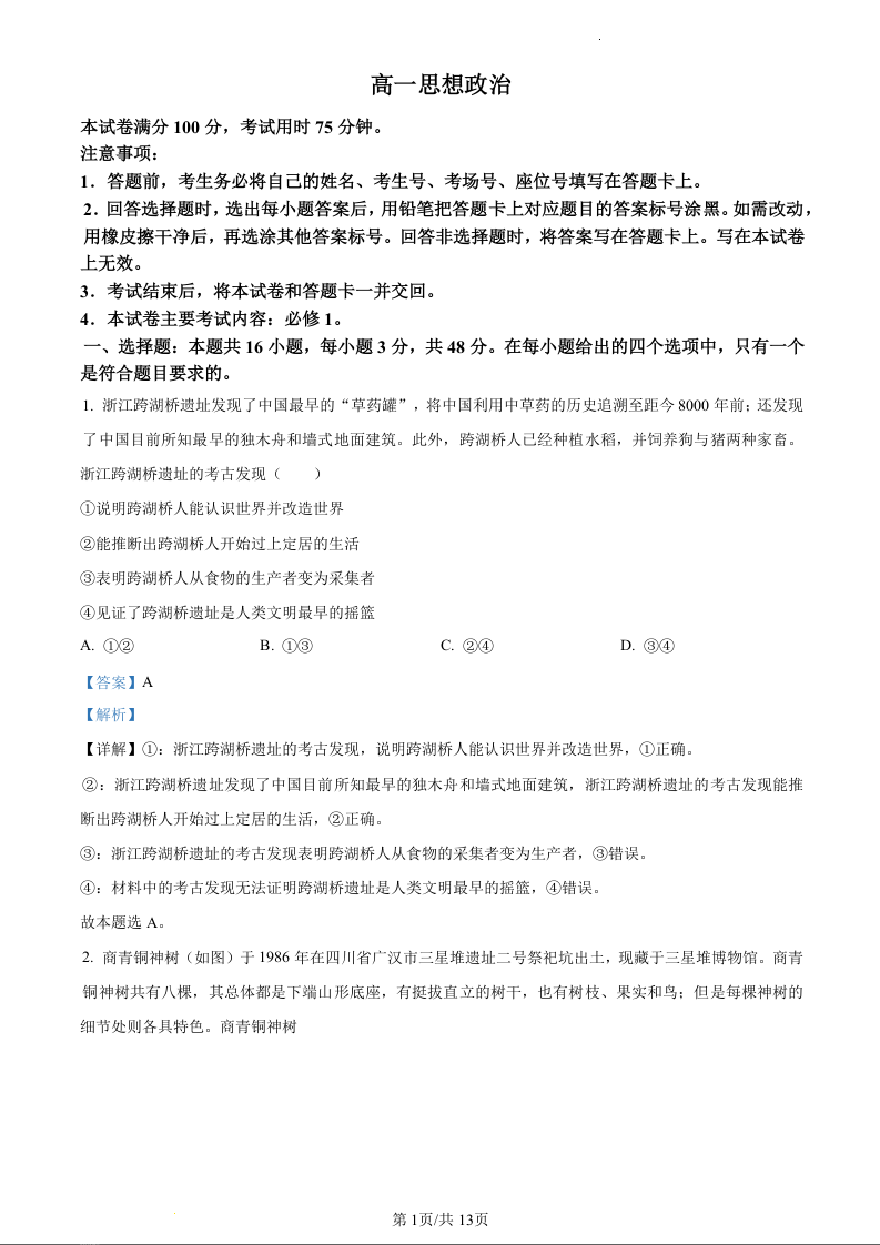 广东省湛江市2023-2024学年高一上学期期中考试政治(精品解析版)