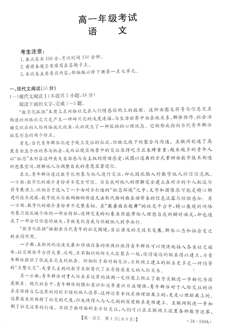 贵州省遵义市2023-2024学年高一下学期6月月考语文