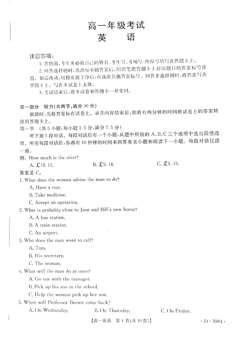 贵州省遵义市2023-2024学年高一下学期6月月考英语
