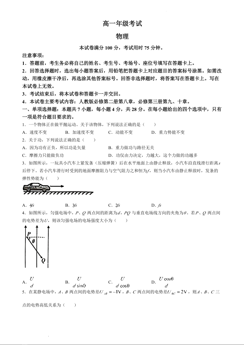 贵州省遵义市2023-2024学年高一下学期6月月考物理
