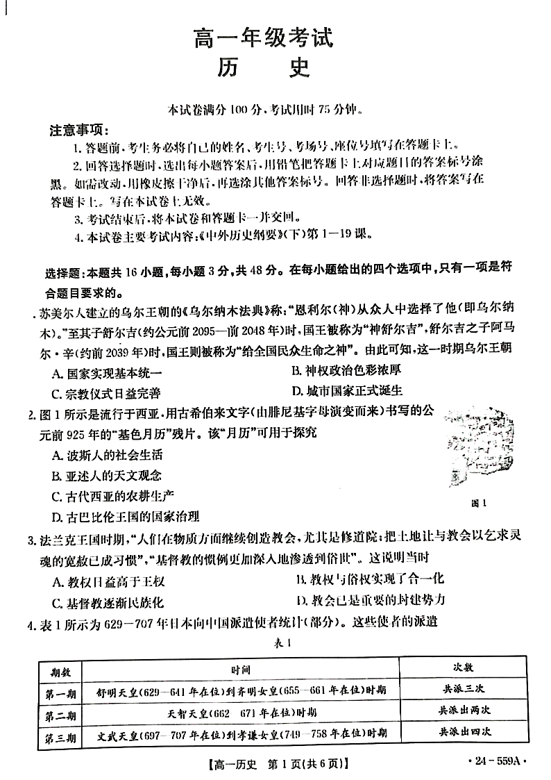 贵州省遵义市2023-2024学年高一下学期6月月考历史