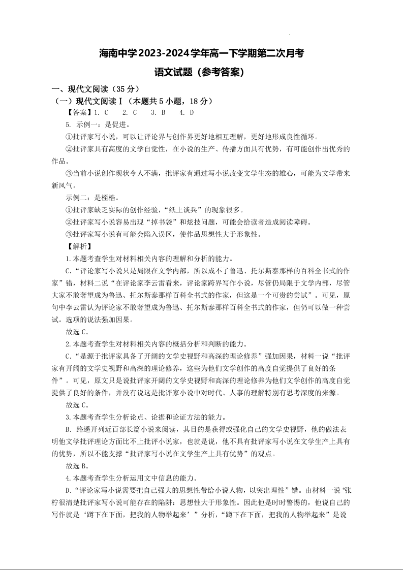 海南省海口市海南中学2023-2024学年高一下学期第二次月考语文答案