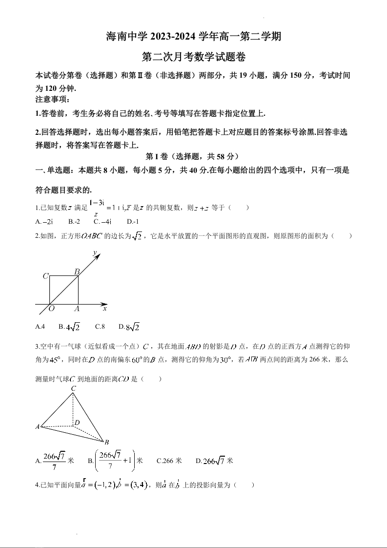 海南省海口市海南中学2023-2024学年高一下学期第二次月考数学+答案