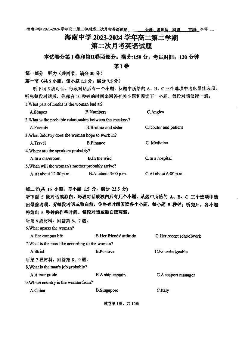 海南省海口市海南中学2023-2024学年高一下学期第二次月考英语