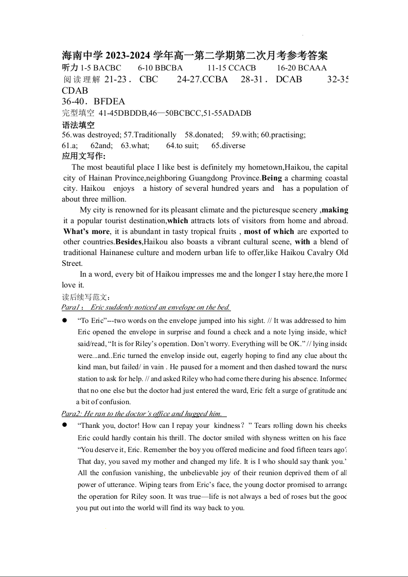 海南省海口市海南中学2023-2024学年高一下学期第二次月考英语答案