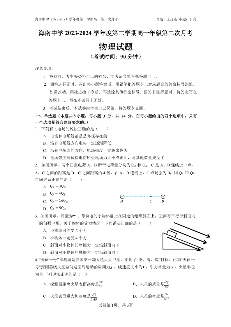海南省海口市海南中学2023-2024学年高一下学期第二次月考物理