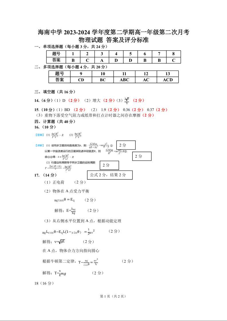 海南省海口市海南中学2023-2024学年高一下学期第二次月考物理答案