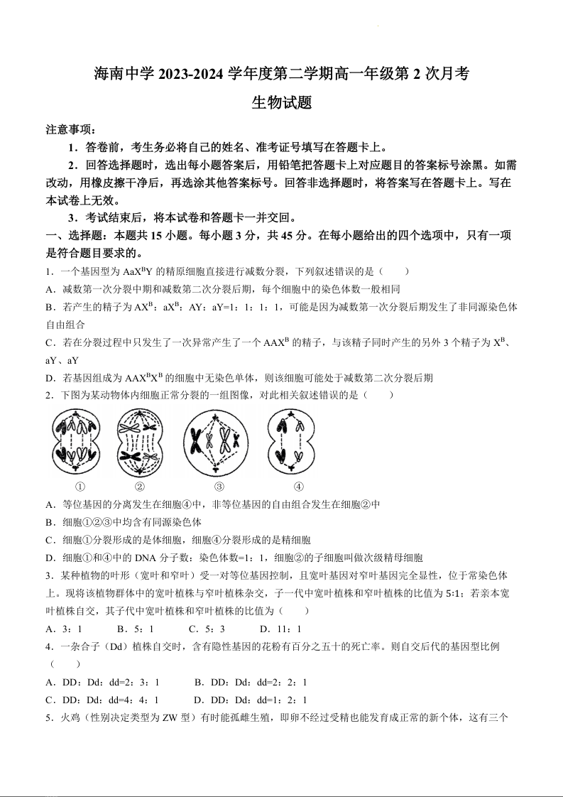 海南省海口市海南中学2023-2024学年高一下学期第二次月考生物