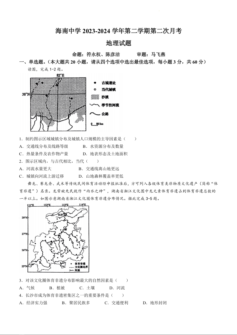 海南省海口市海南中学2023-2024学年高一下学期第二次月考地理