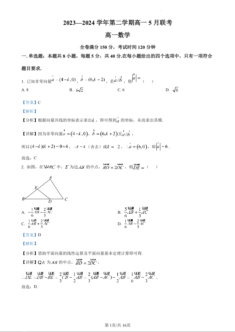 河南省商丘市2023-2024学年高一下学期5月月考数学(精品解析版)