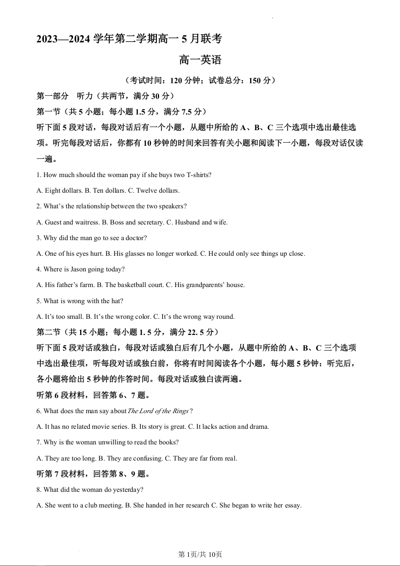 河南省商丘市2023-2024学年高一下学期5月月考英语(原卷版)
