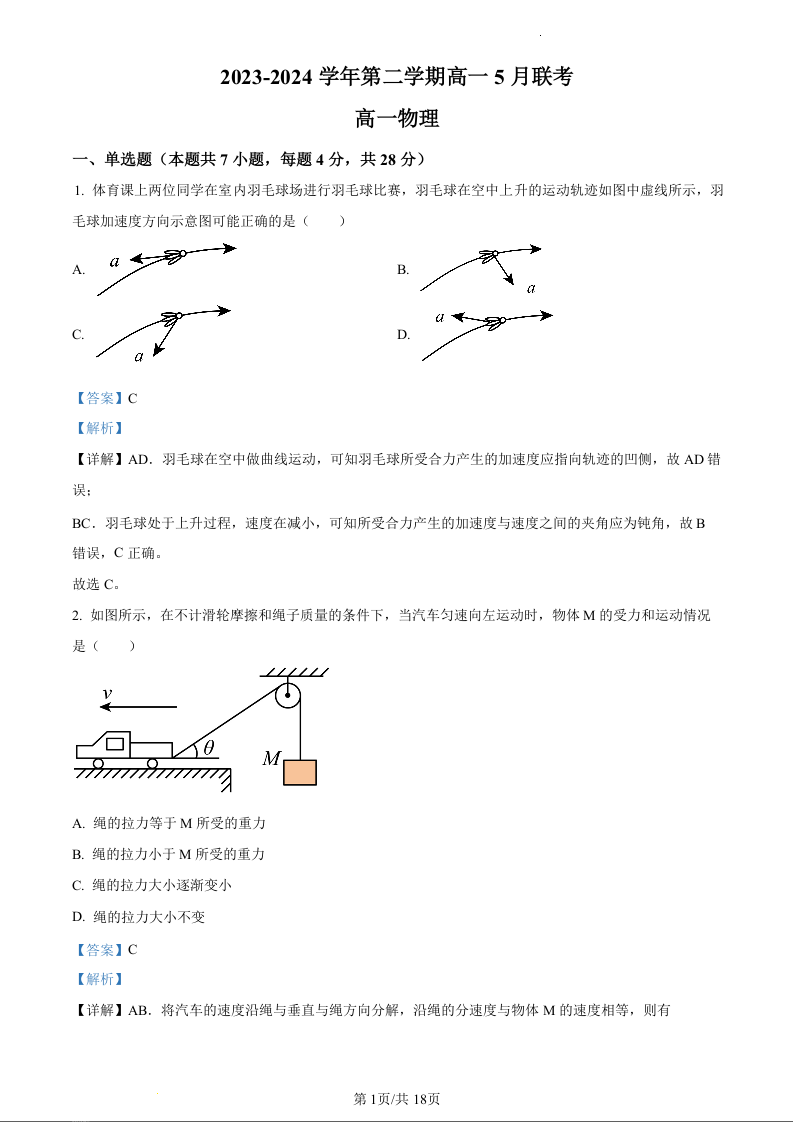 河南省商丘市2023-2024学年高一下学期5月月考物理(精品解析版)