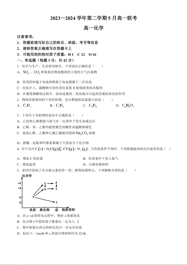 河南省商丘市2023-2024学年高一下学期5月月考化学