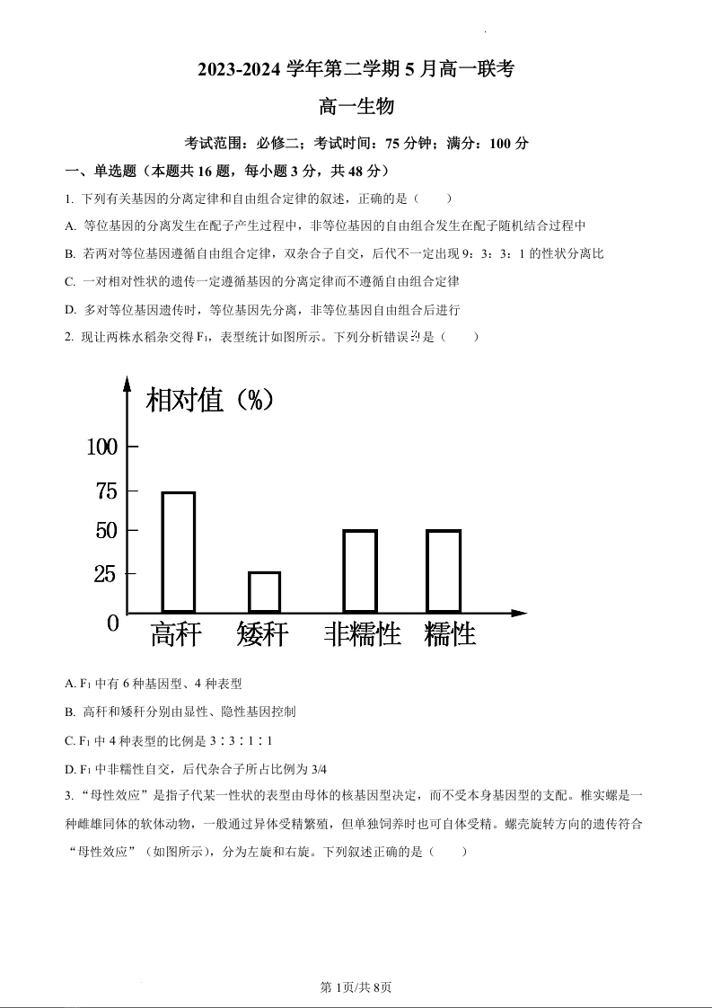 河南省商丘市2023-2024学年高一下学期5月月考生物(原卷版)