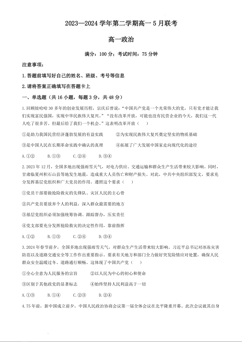 河南省商丘市2023-2024学年高一下学期5月月考政治