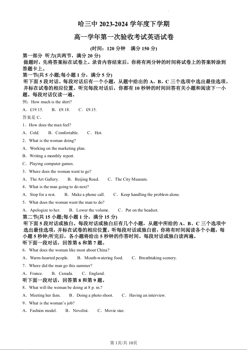 黑龙江省哈尔滨市第三中学2023—2024 学年高一下学期第一次验收考试英语(原卷版)