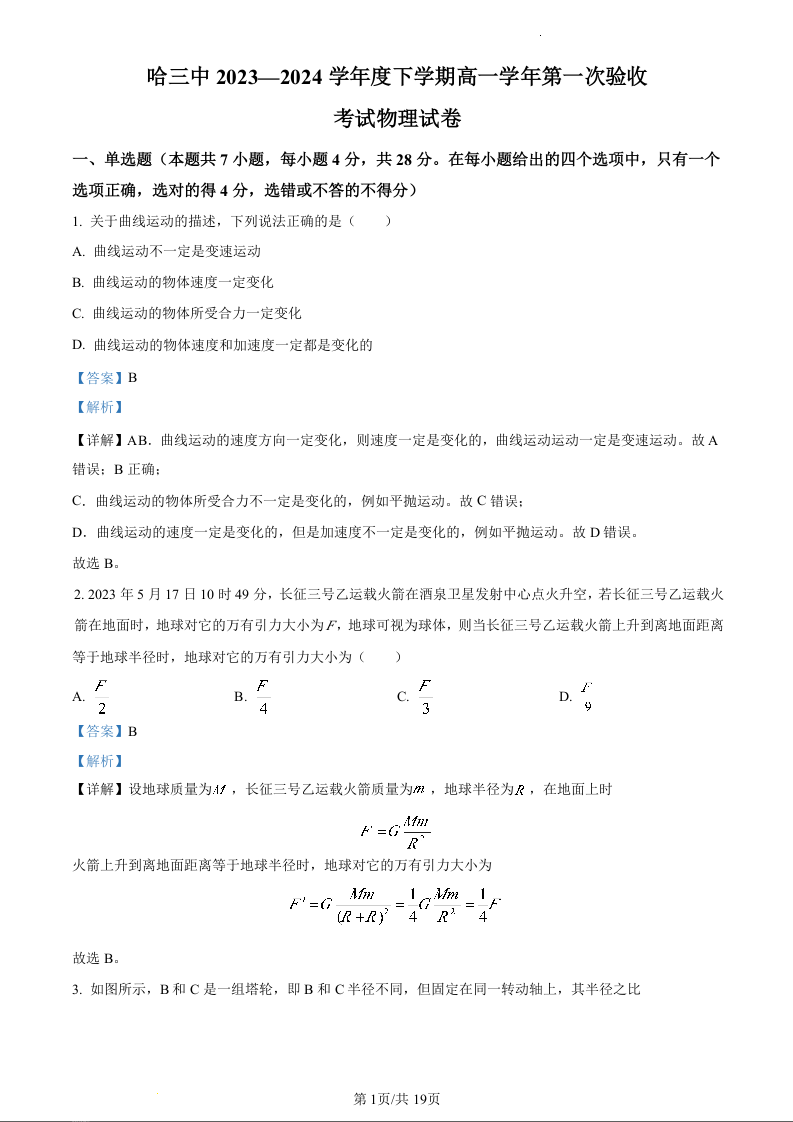 黑龙江省哈尔滨市第三中学2023—2024 学年高一下学期第一次验收考试物理(精品解析版)
