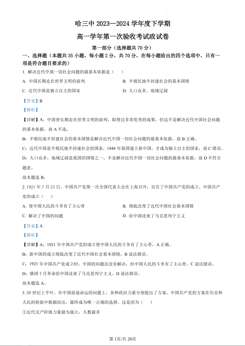 黑龙江省哈尔滨市第三中学2023—2024 学年高一下学期第一次验收考试政治(精品解析版)
