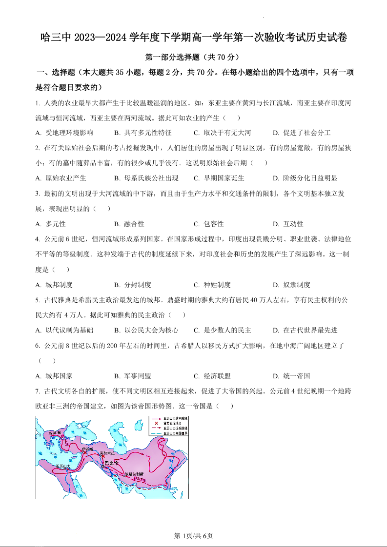 黑龙江省哈尔滨市第三中学2023—2024 学年高一下学期第一次验收考试历史(原卷版)