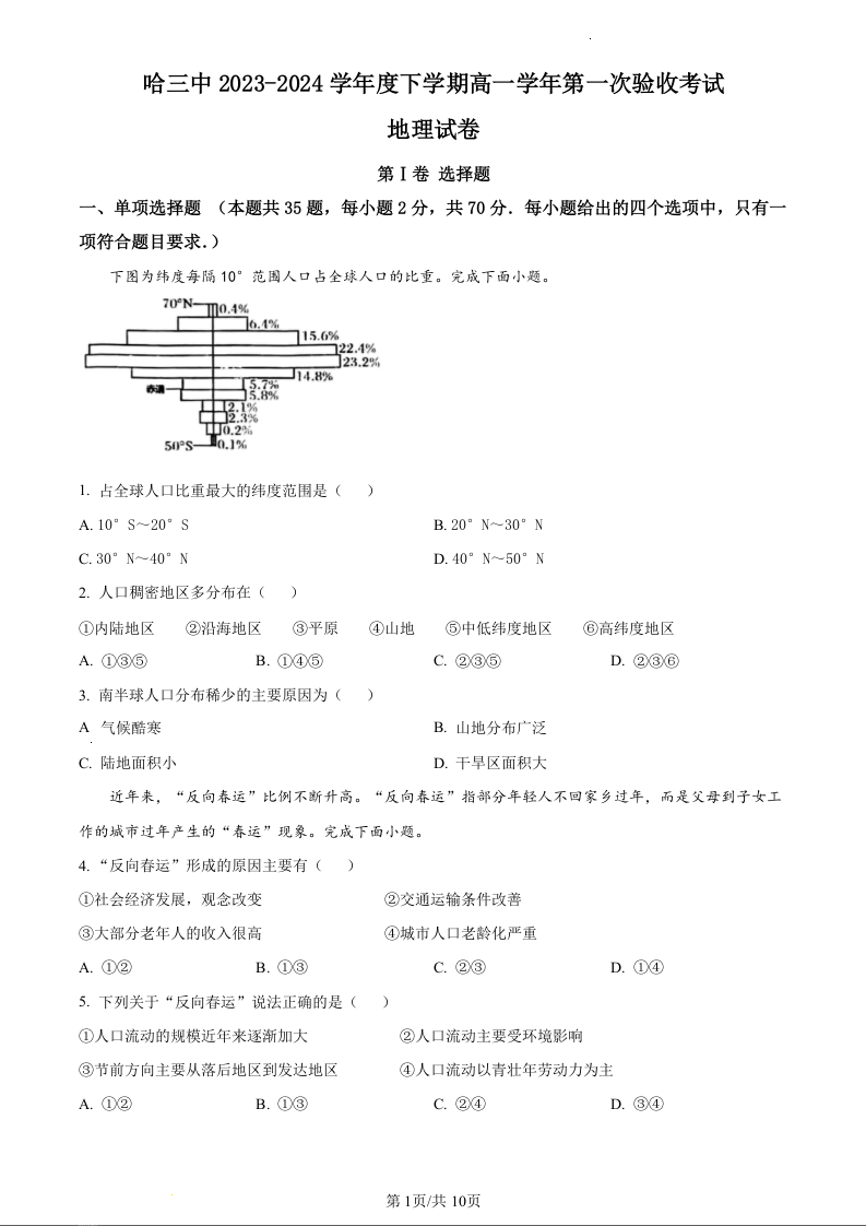 黑龙江省哈尔滨市第三中学2023—2024 学年高一下学期第一次验收考试地理(原卷版)