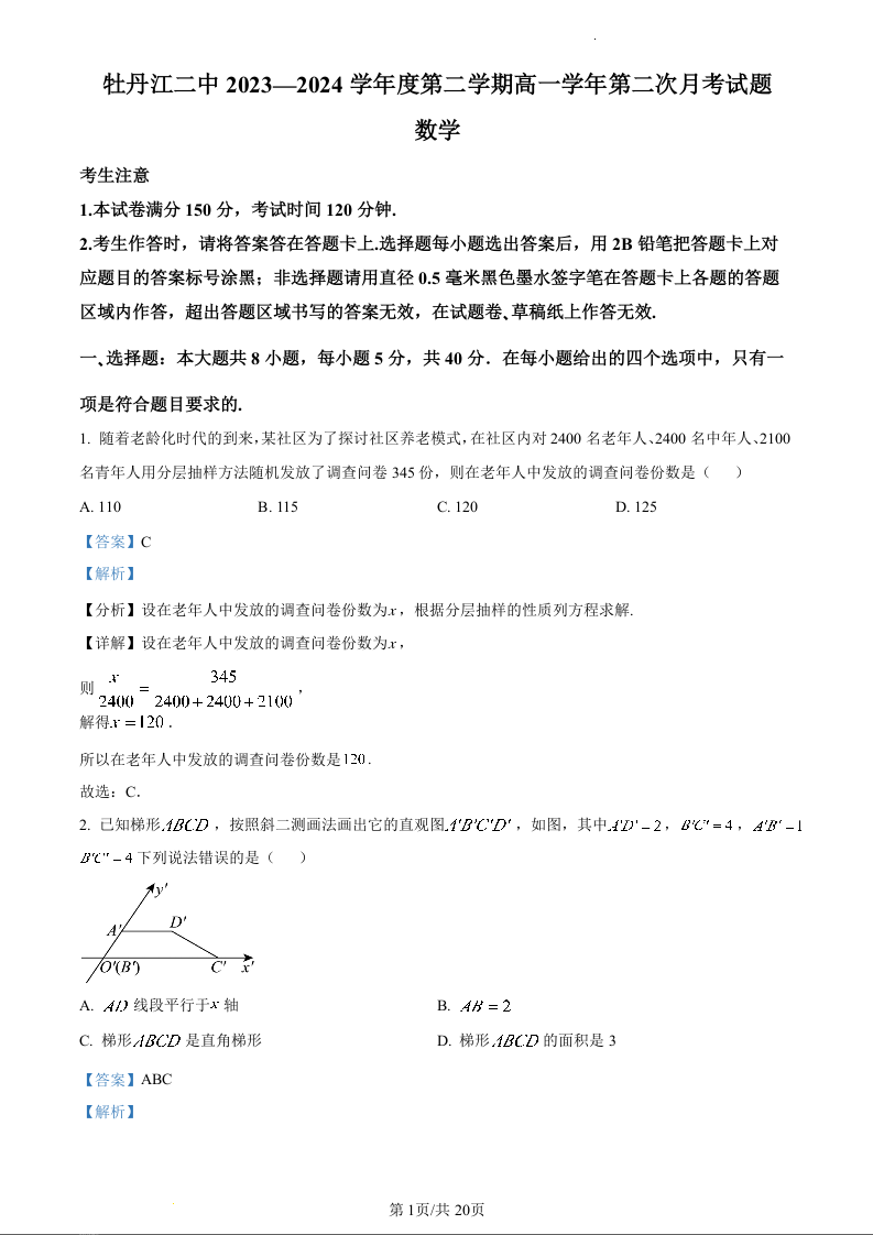 黑龙江省牡丹江市第二高级中学2023-2024学年高一下学期6月月考数学(精品解析版)