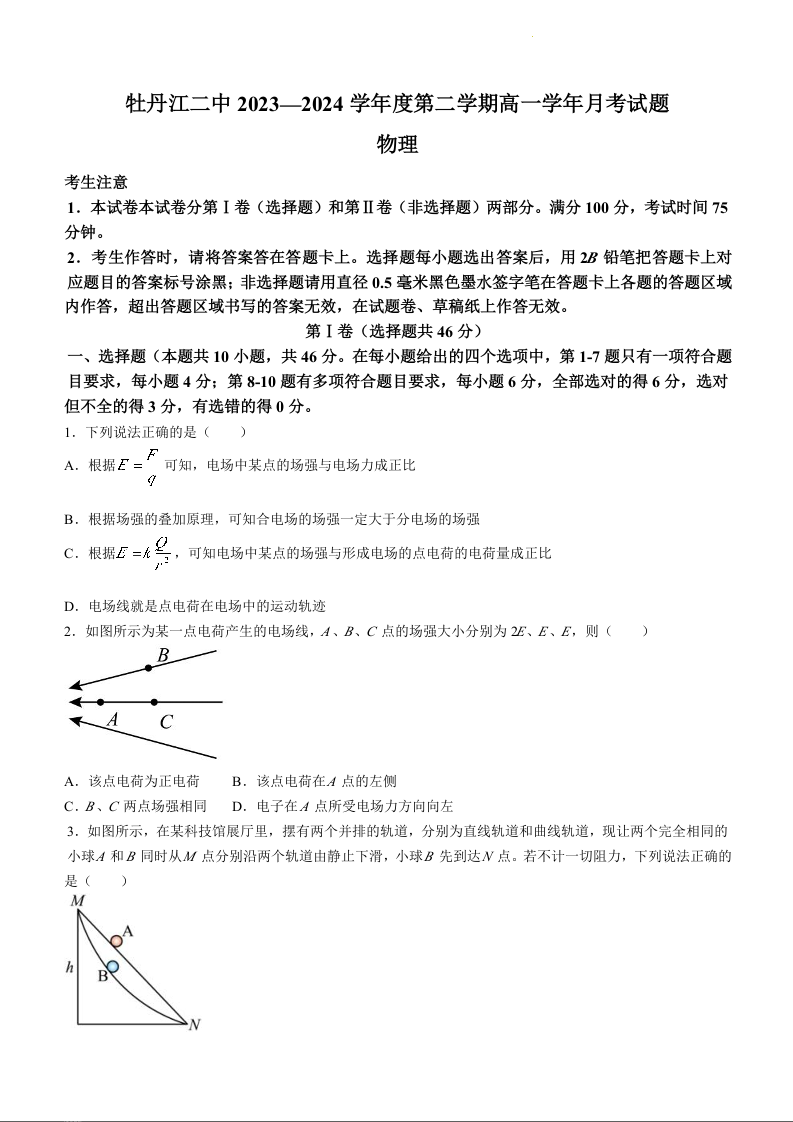 黑龙江省牡丹江市第二高级中学2023-2024学年高一下学期6月月考物理