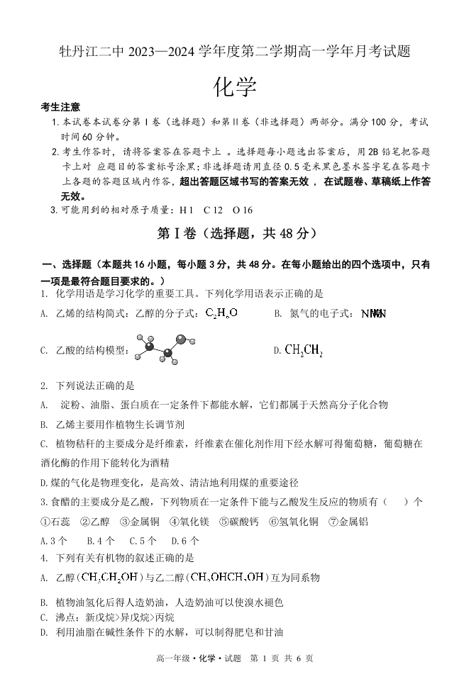 黑龙江省牡丹江市第二高级中学2023-2024学年高一下学期6月月考化学