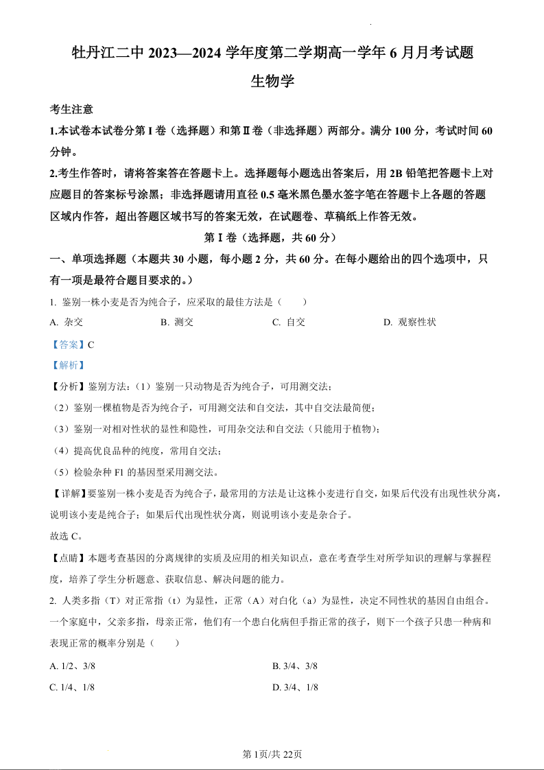 黑龙江省牡丹江市第二高级中学2023-2024学年高一下学期6月月考生物(精品解析版)